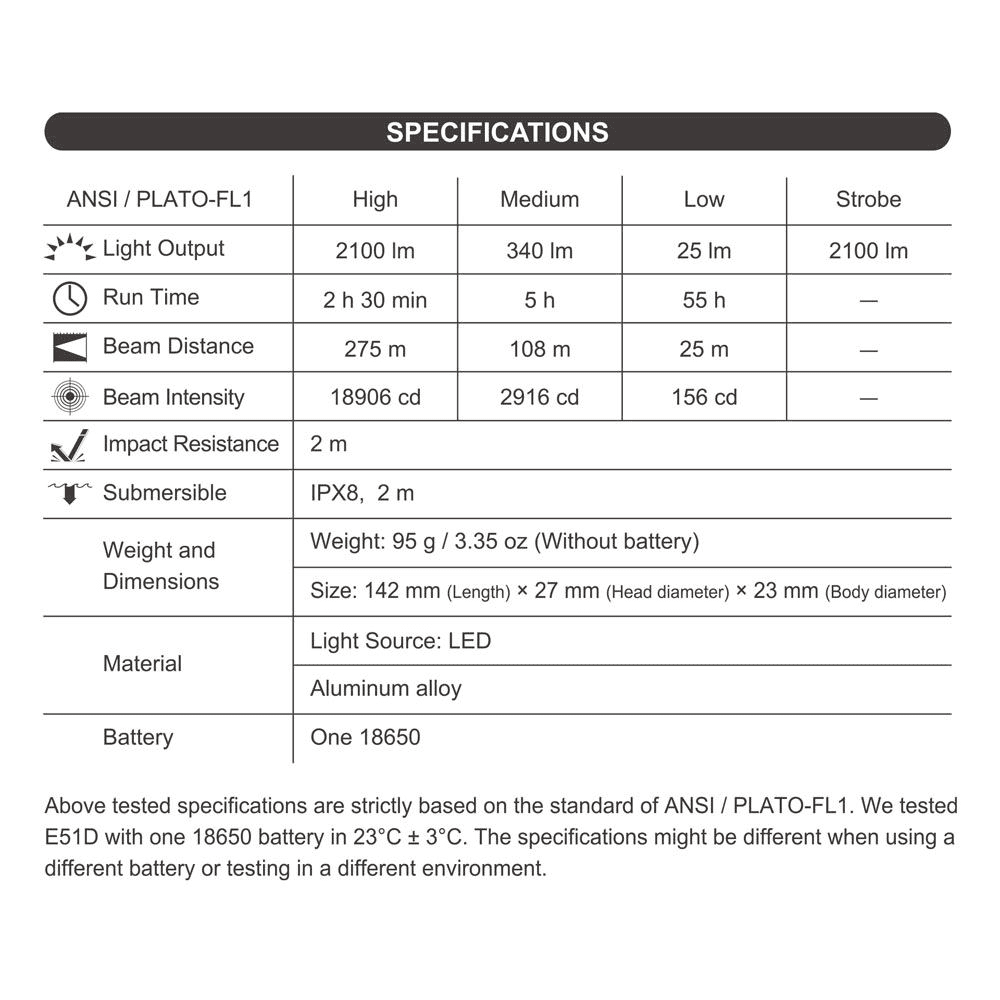 NEXTORCH E52D är en kompakt och högpresterande ficklampa (EDC) utvecklad för polis, ordningsvakter och räddningstjänst. Med en ljusstyrka på hela 3700 lumen och en räckvidd på 280 meter kombinerar den lång räckvidd med bred synfältsbelysning. Lampan drivs av ett laddbart 4800 mAh 21700-batteri och har USB-C-laddning, vilket säkerställer upp till 60 timmars drift på lägsta effekt.