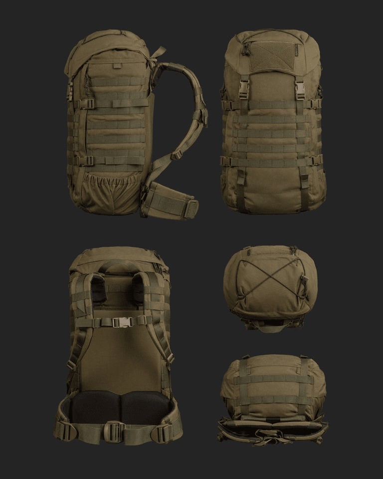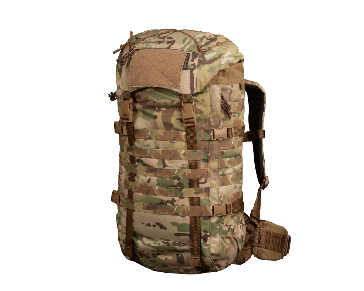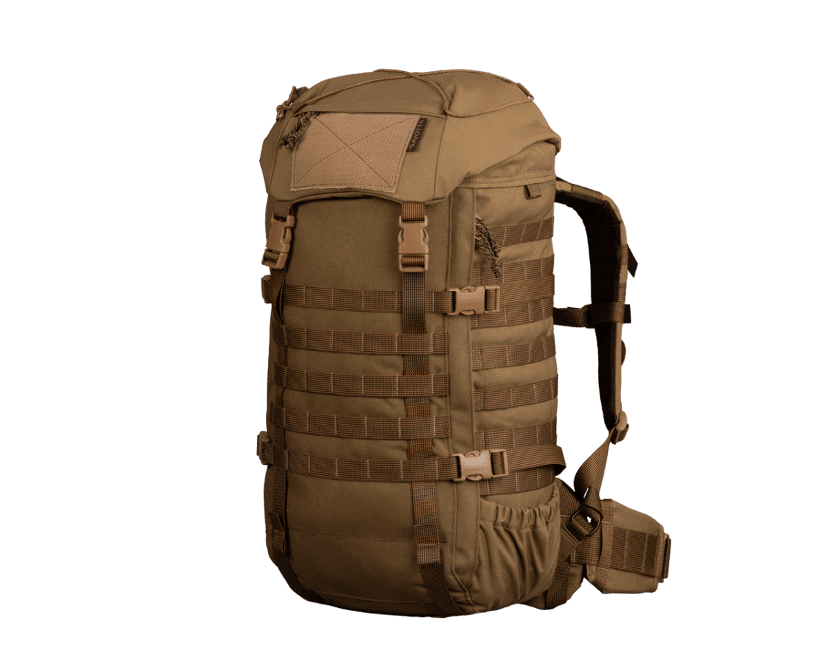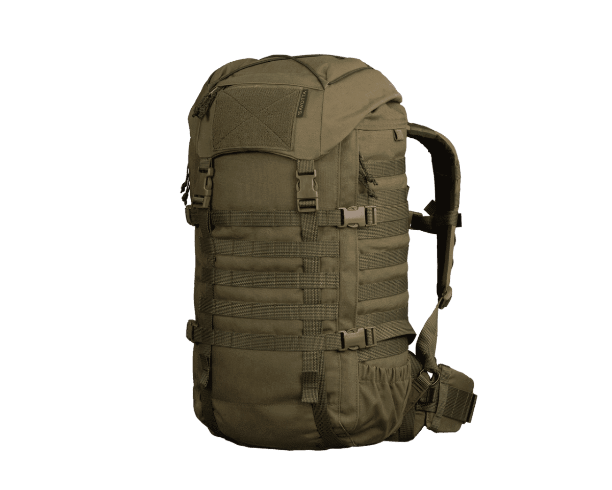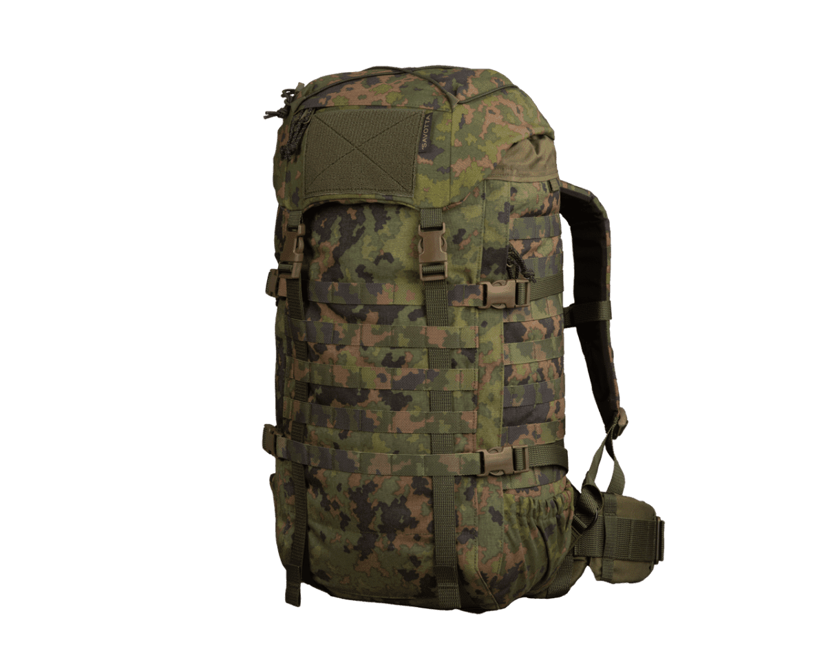 Savotta Kantamus är en högpresterande ryggsäck utvecklad för yrkesverksamma inom försvar och säkerhet som kräver full kontroll och ergonomisk avlastning vid transport av tung utrustning. Konstruktionen vilar på en intern aluminiumram som effektivt fördelar vikten och bibehåller säckens vridstyvhet även under maximal belastning. Ryggsäcken kombinerar en vädersäker rulltoppsförslutning med en praktisk sidodragkedja för snabb åtkomst till huvudfacket. Tack vare sin modulära uppbyggnad och omfattande PALS/MOLLE-system kan utrustningen anpassas specifikt efter uppdragets art, från kortare insatser till flerdagarsoperationer i krävande terräng.