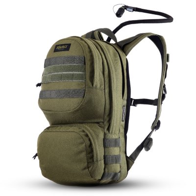 Versatile tactical hydration & cargo backpack with a large main compartment and two outside pockets for easy access to MREs, ammo and other essentials.